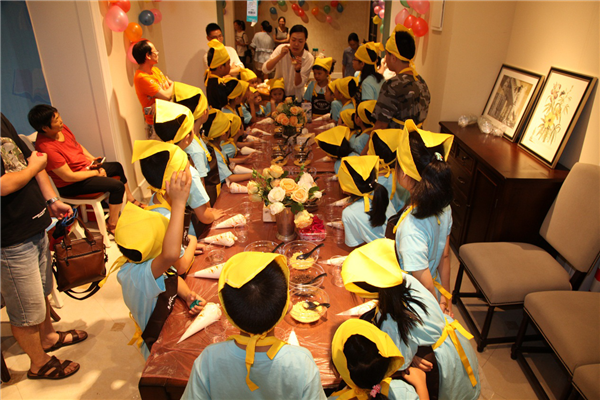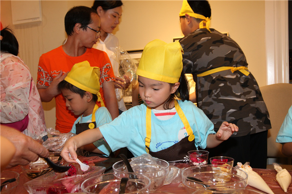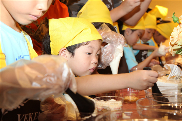 鋪上薄薄的一層餅干碎,擠上一層厚厚的奶油,再鋪上一層餅干碎,再擠上一層奶油……看似簡單的操作,著實(shí)讓小朋友們手忙腳亂了一番,這倒是樂壞了旁邊本就蠢蠢欲動(dòng)的家長們,紛紛上手親自操刀原本就不大的場地顯得更加熱鬧擁擠。